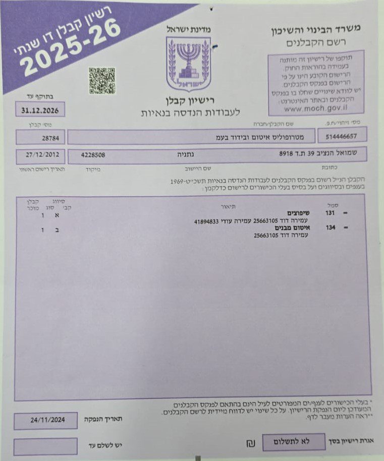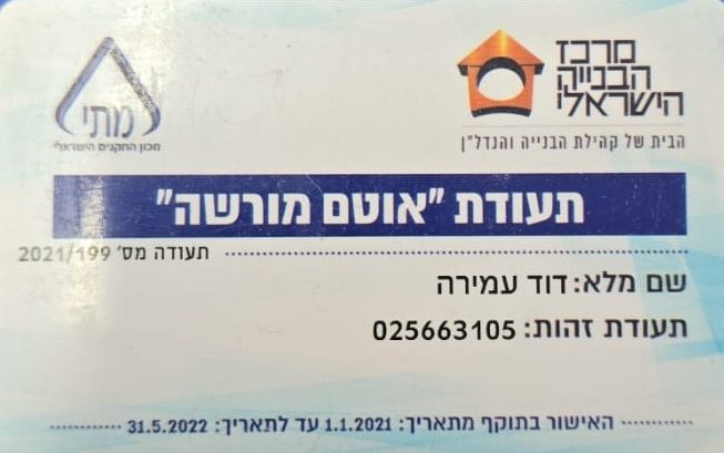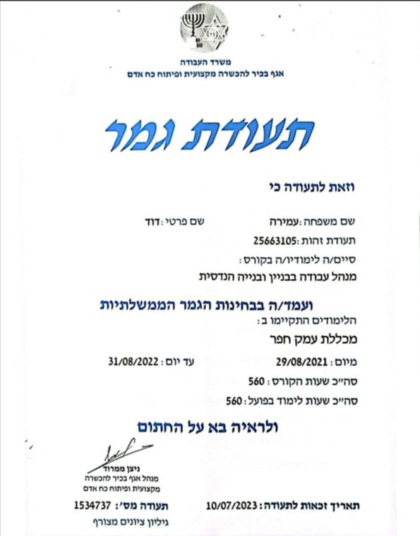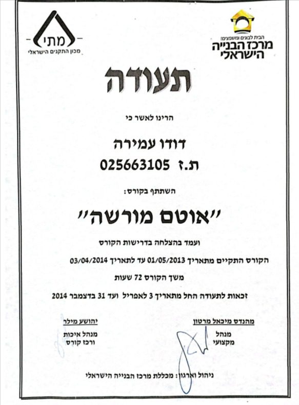דוד מנהל עבודה בעל הסמכה מטעם משרד השיכון והבינוי, קבלן רישום ומוכר בהתאחדות הקבלנים, אוטם מורשה מטעם מכללת בילדינג ומנהל מוסמך מטעם משרד העבודה.
