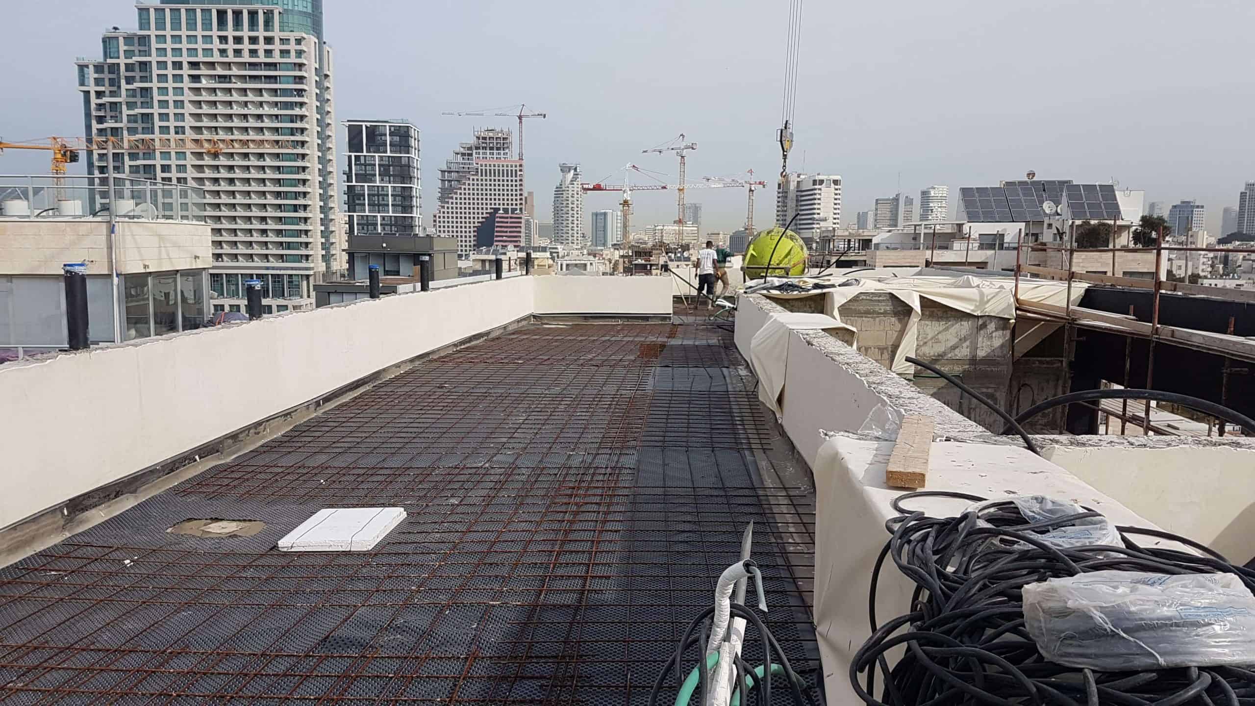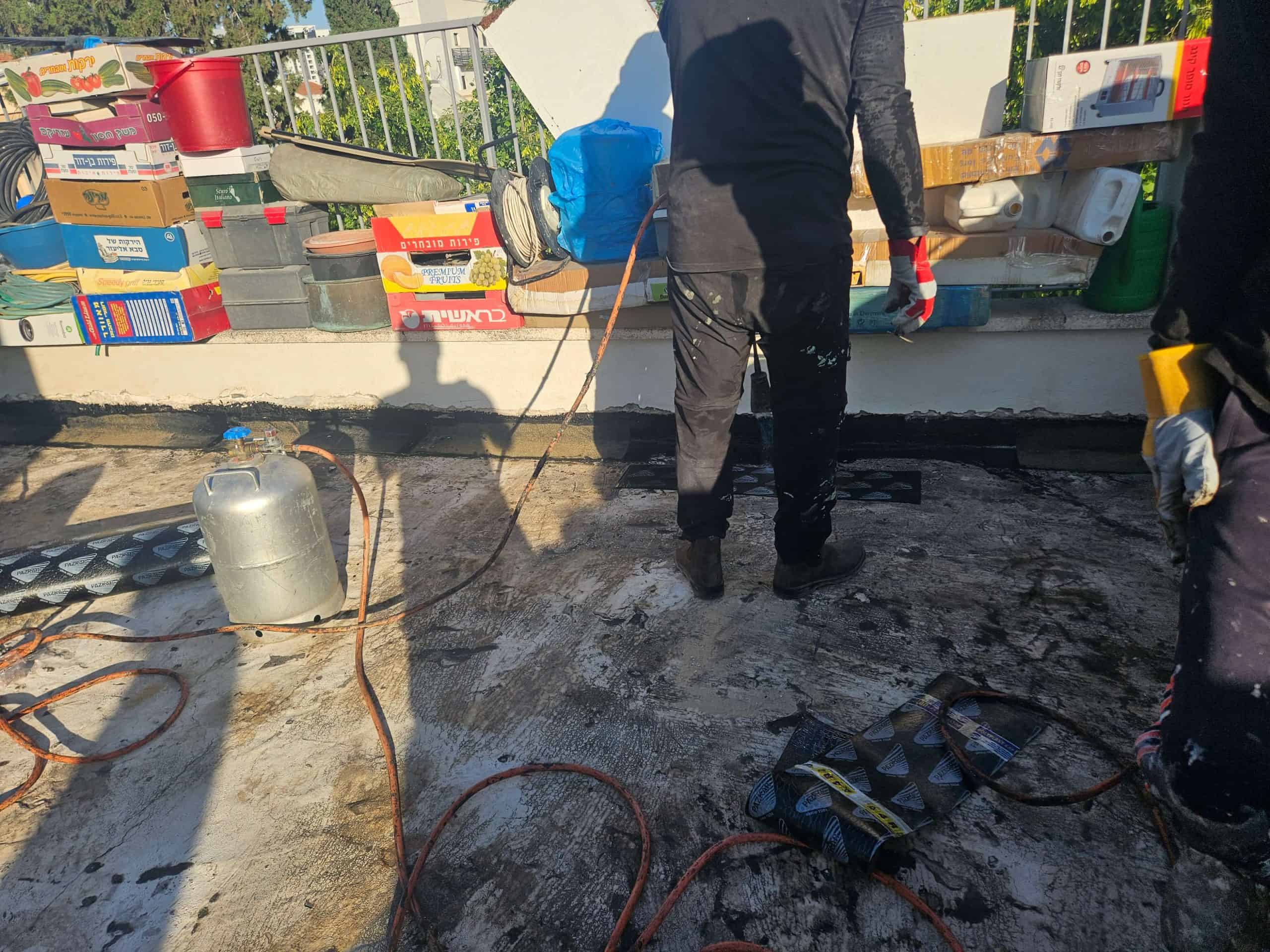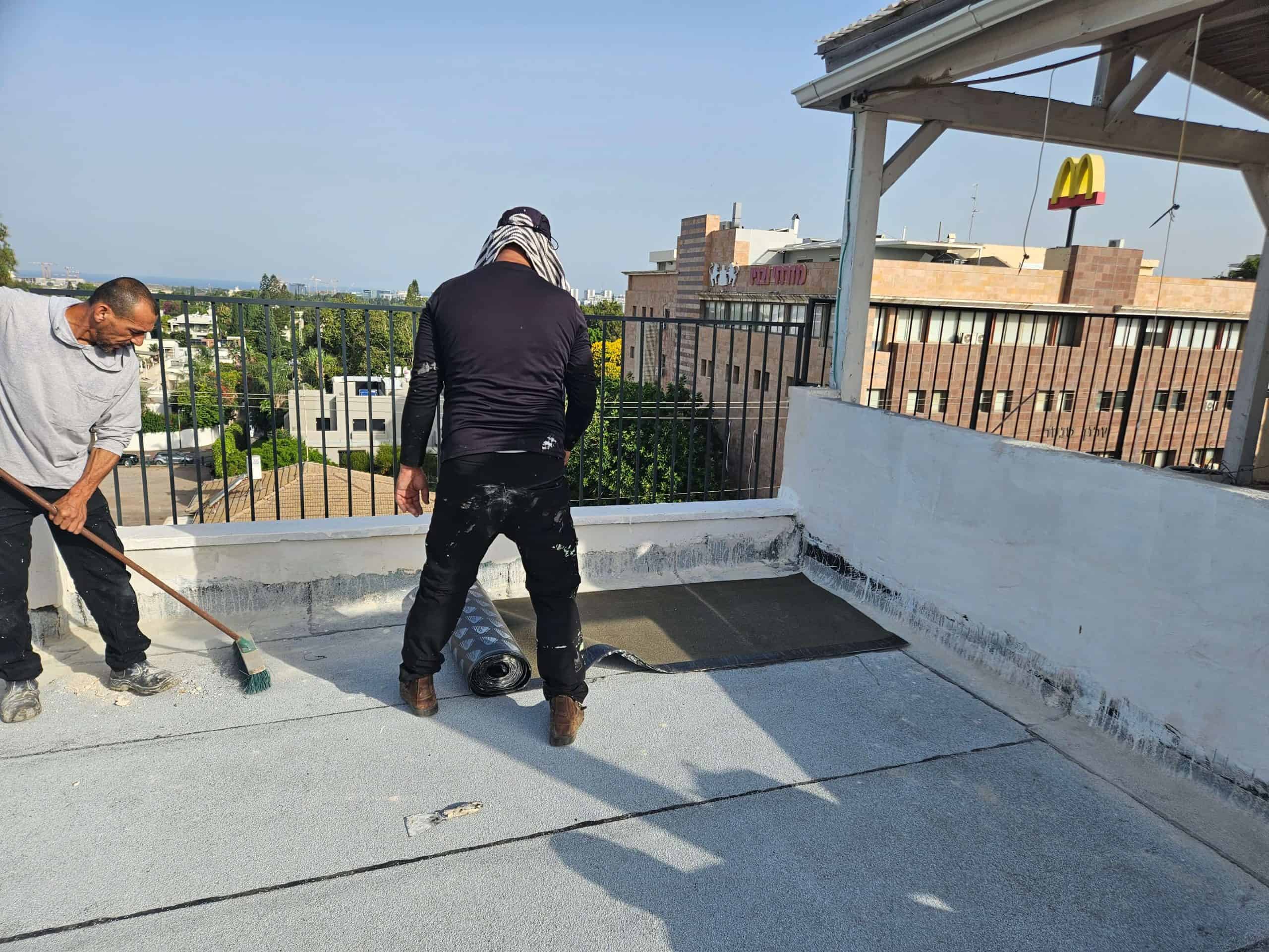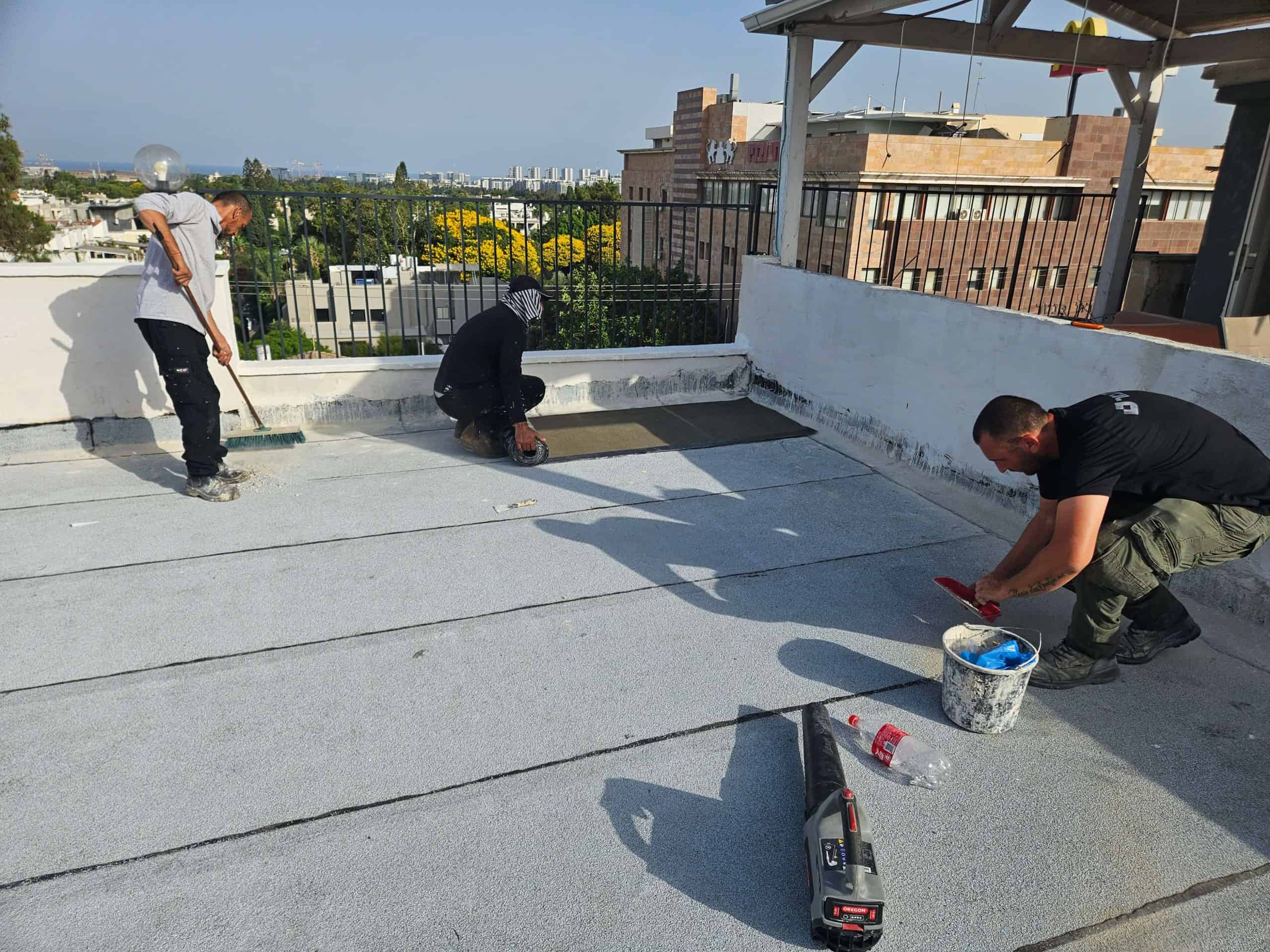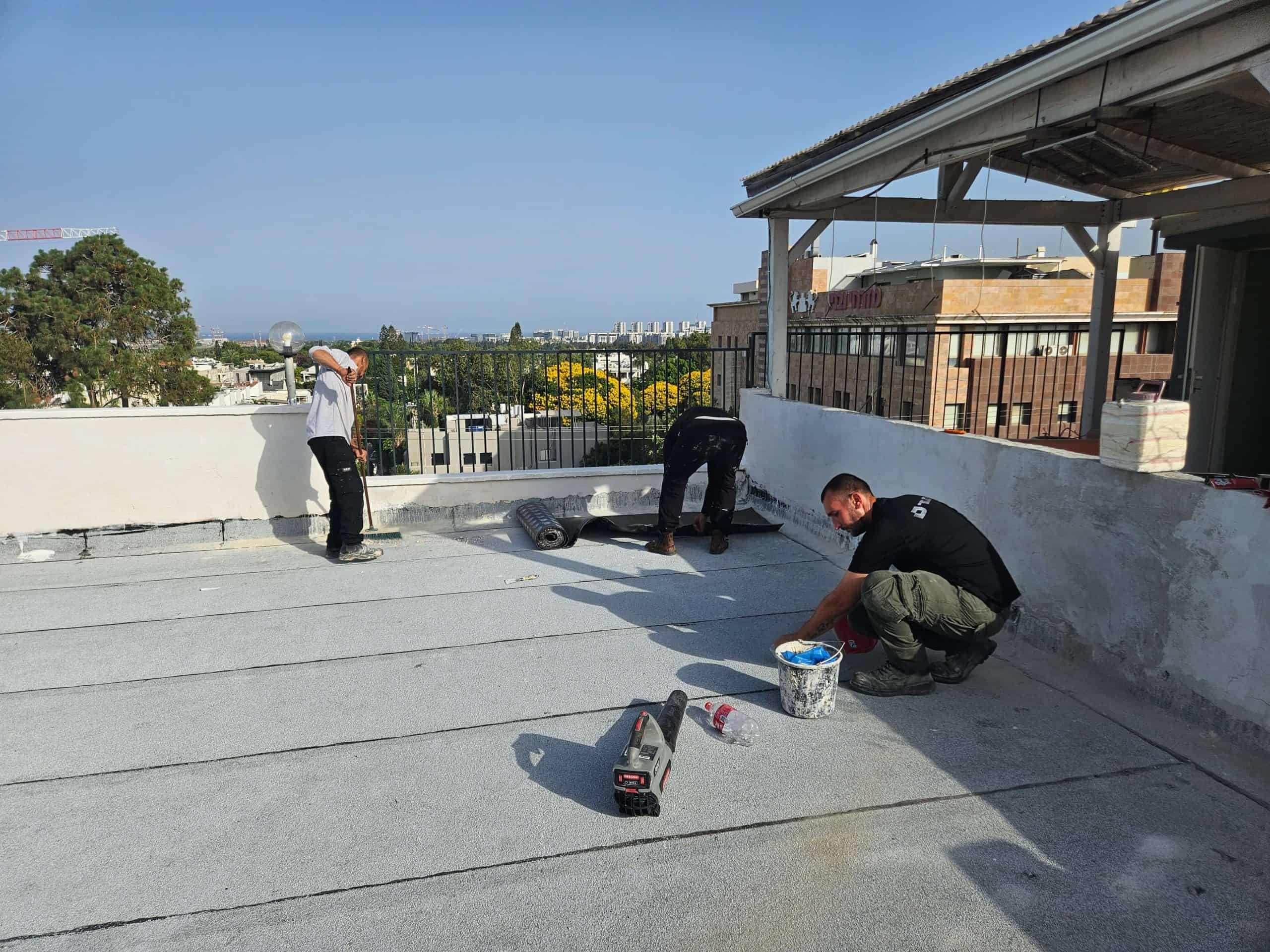 - הכנת השטח :שלב קריטי שכולל ניקוי יסודי של המשטח, תיקון תשתית פגומה, איטום קירות מעקה ונקודות תורפה (כגון מרזבים ופתחים), ויישום פריימרים מקשרים.